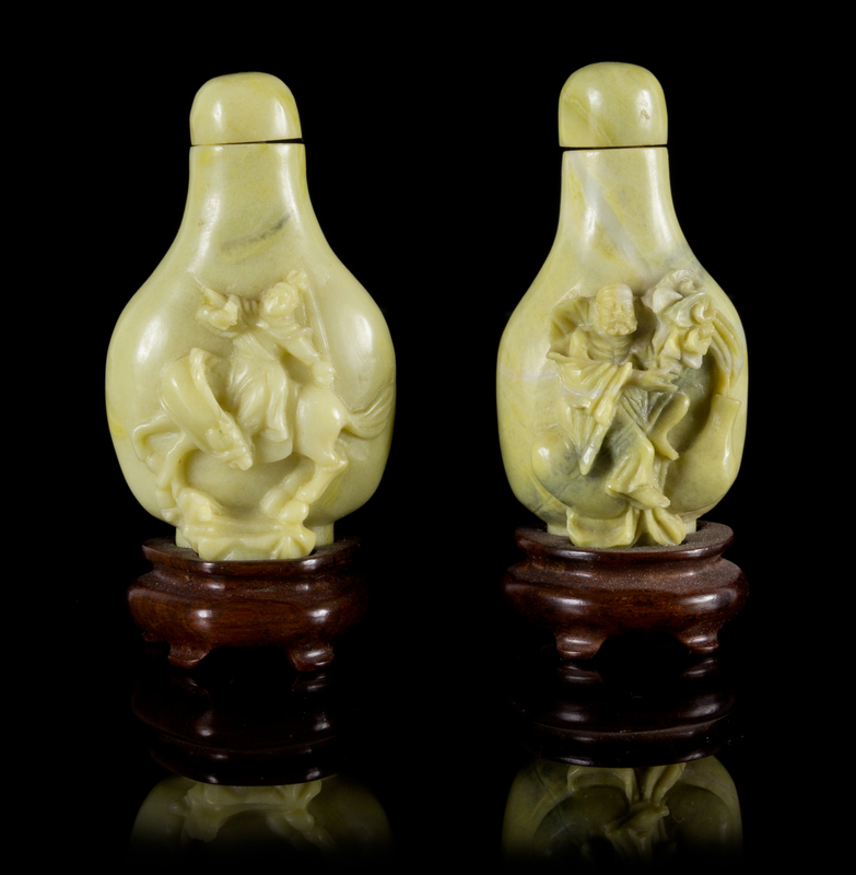 the first of elongated pear form with a flattened back, carved in high-relief to depict a bearded man riding a magical gourd, the second of pear form with a flattened back, carved in high-relief to depict a warrior on horseback, both of yellowish-green hardstone and mounted on fitted wooden stands.