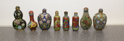 the first of flattened double-gourd form raised on an oval foot, the black ground painted with gold cloudlets and sprays of peony and soaring birds on both sides, with matching stopper, the second of cylindrical form depicting a continuous design of a five-clawed dragon in blue and yellow enamel chasing a flaming pearl, all against a dark red ground painted with cloudlets, the third an enamel on glass example of elongated pear form raised on a circular foot, both sides decorated with a polychrome flowering branch against a scale-patterned transparent ground, the fourth of cylindrical form, depicting a continuous design of a five-clawed dragon in green and blue enamels chasing a flaming pearl, all against a dark red ground painted with cloudlets, the fifth of cylindrical form depicting a continuous design of lotus and cherry blossoms in green, blue and yellow enamel, all against a dark red ground painted with cloudlets, the sixth of rounded form bulging toward the base with elongated neck, depicting a continuous design of a five-clawed dragon in blue, green, and yellow enamel, all against a dark red ground painted with cloudlets, the seventh of flattened shield form, moulded with a polychrome enamel overlay on a copper ground depicting an Indian lotus and scrolling floral design, the eighth of flattened shield form with a polychrome enamel Indian lotus and scrolling floral design against a dark blue ground.