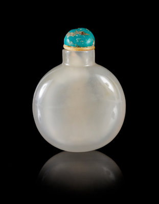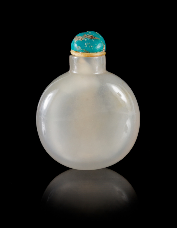 the rounded body of an opaque near-white hue, having a malachite stopper.
