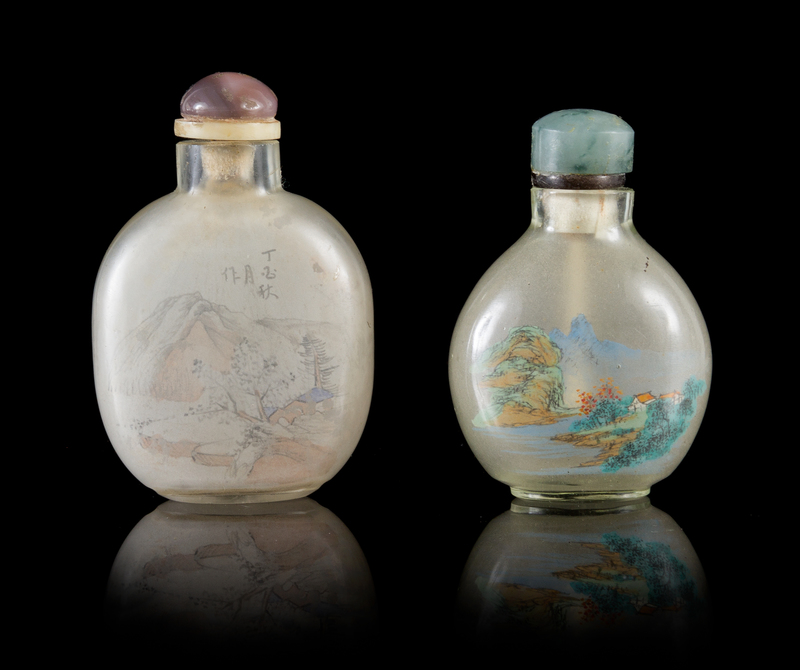 the first of flattened form painted on one side showing a mountainous landscape, the reverse with blooming prunus, having an agate stopper; the second of a circular form with similar decoration, having a jadeite stopper.