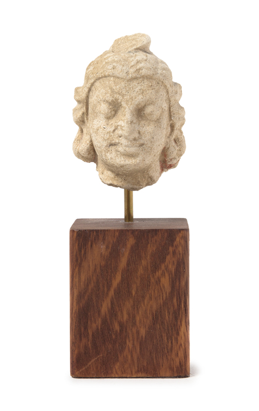 having a calm facial expression with a pair of almond shaped eyes above an aquiline nose, with curly hair, raised on a later hardwood stand.