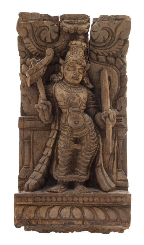 depicting a deity with her hips shifted to the right, holding an attribute in each hand, wearing a dhoti and a tall tiara, standing in an architectural alcove with foliate scrolls.