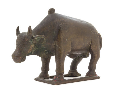 having a serene expression and a geometric decorative element on the forehead, four incised decorative floral elements on the body, the four hoofed feet joined on three sides.