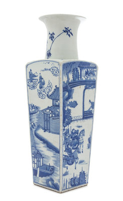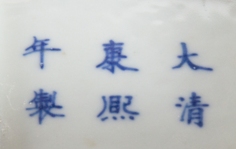 having a straight neck surmounted by an everted mouth rim, painted to depict a battle scene, the underside bearing a Kangxi six-character mark in underglaze blue.