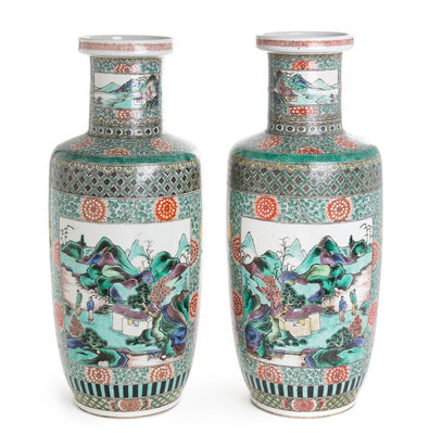A Pair of Famille Verte Porcelain Rouleau Vases