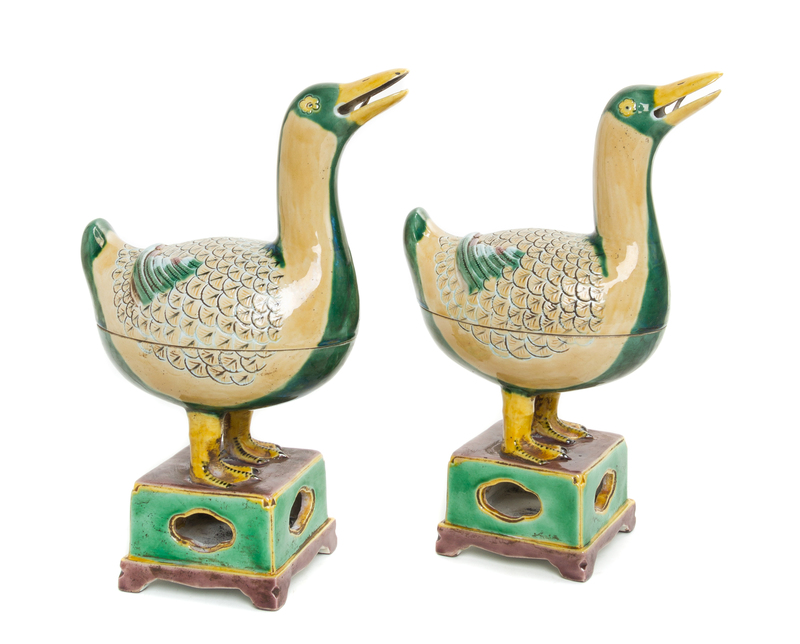 A Pair of Famille Verte Porcelain Duck-Form Covered Vessels