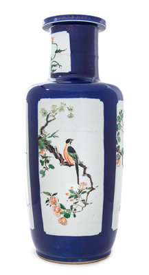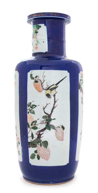 A Famille Verte Powder Blue and Gilt Ground Porcelain Rouleau Vase
