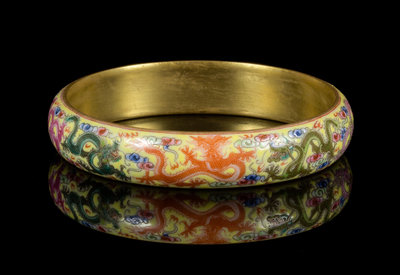 painted to depict a parade of dragons amongst clouds and flames above a light yellow ground.