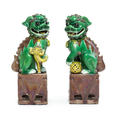 each resting on a tall square base, the male with the left front paw resting on a reticulated brocade ball, the female with a cub.