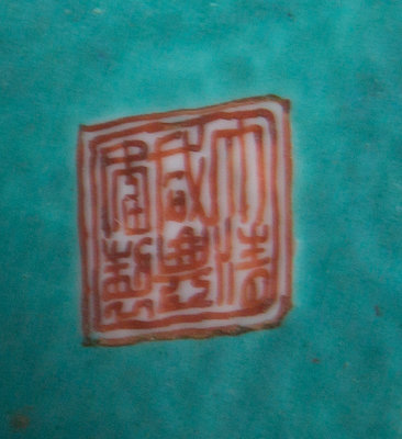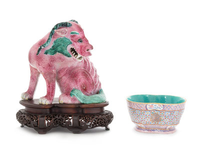 the first a bowl of bi-lobed rounded rectangular form raised on a slightly flared foot, decorated with and allover floral pattern, the interior of solid turquoise enamel, the underside bearing a Xianfeng six-character mark, the second a figure of a horned mythical beast.