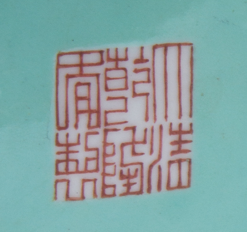 of circular form, the interior depicting a bird perched on a flowering tree on a bright yellow ground, the underside bearing an apocryphal Qianlong six-character iron red mark within a square panel against a turquoise ground.