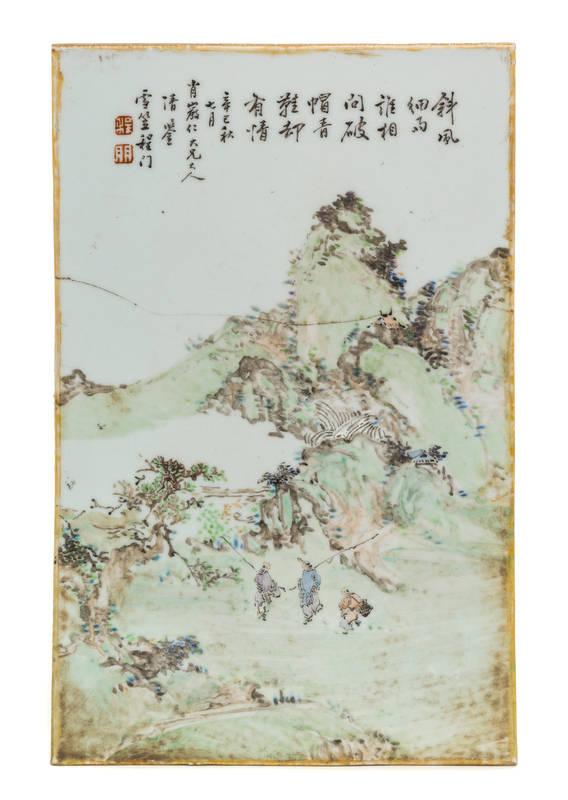 of rectangular form, depicting three figures in a mountainous scene, with an inscription and two seals to the upper register, signed Cheng Xueli.