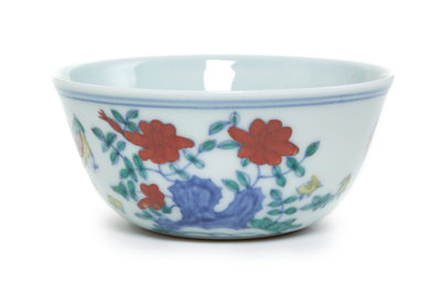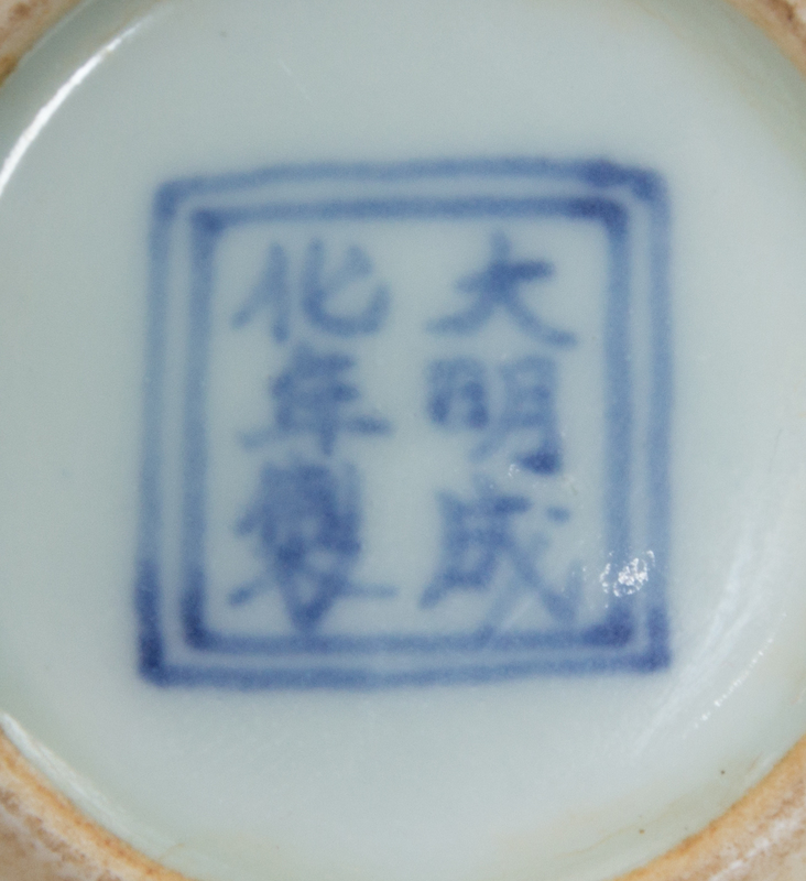 painted to depict flowers and chickens, the underside bearing an apocryphal Chenghua six-character mark within a double square panel.
