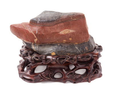 of naturalistic form with black and red bands, raised on a fitted hardwood stand.