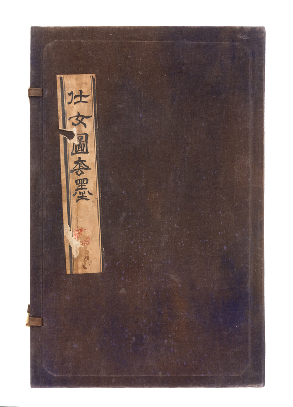 of various shapes, depicting ladies in landscape scenes, set in a fitted box.