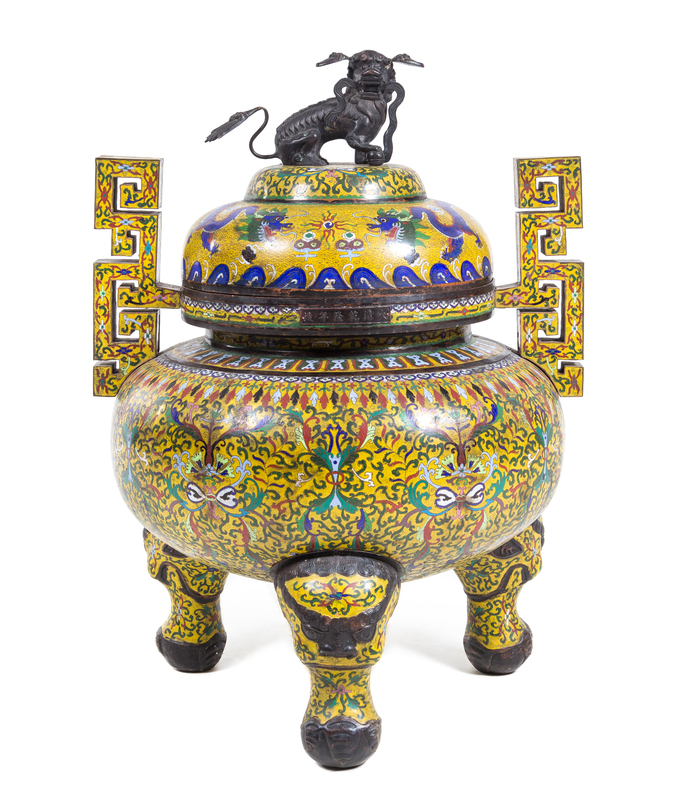 the globular form body flanked by a pair of scroll handles, raised on three cabriole legs with beast masks, decorated with dense meandering lotus vines against a yellow ground, the domed cover painted with striding dragons chasing the flaming pearls, surmounted by a fu lion form finial, impressed with an apocryphal Qianlong six-character mark to the mouth.