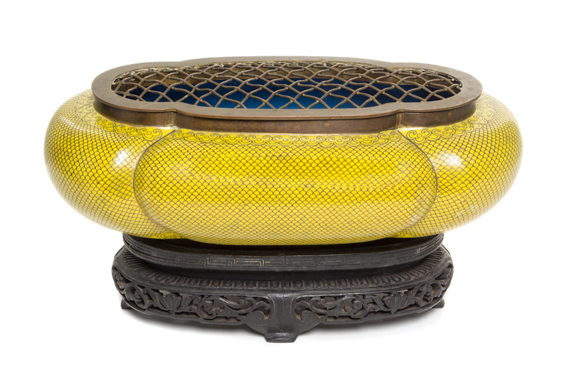 of squat quatrefoil form, decorated with a fishscale motif against a yellow ground, raised on a carved hardwood stand.