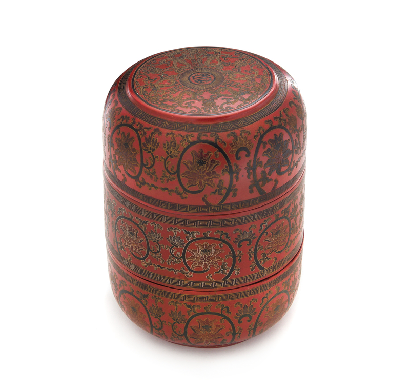 of cylindrical form, the lid over two compartments decorated with red and black lacquer depicting dragons, meandering lotus and keyfret bands, the underside bearing a Qianlong four-character mark.
