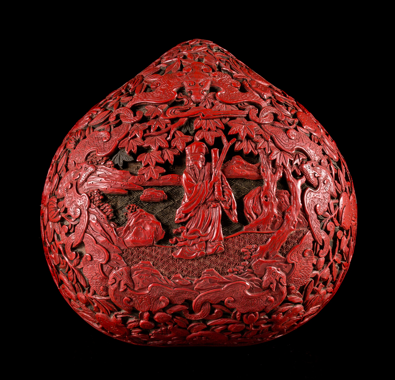 intricately carved to the cover showing a central scholar standing underneath leafy trees, dressed in draped robes with both hands bearing bamboo sections, set in a mountain scene against a diaper ground, enclosed by five large wing bats further surrounded by fruiting pomegranates, peaches, Buddha's hand citron and entwined leafy vines, the base with similar decoration.