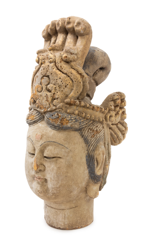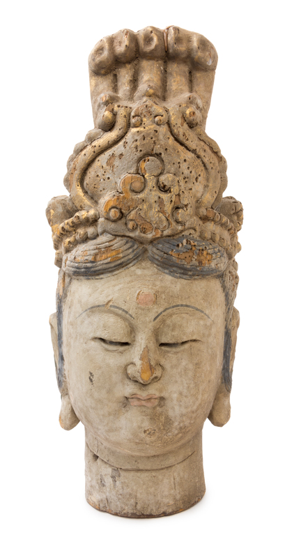 having a serene expression, with arched eyebrows over closed eyes, flanked by elongated earlobes, the hair pulled back into a chignon, surmounted by an elaborate headdress.