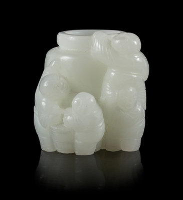 of a well polished even colored stone, of ovoid form, carved to the side in high relief depicting four boys, one climbing onto the jar and two carrying a water bucket.