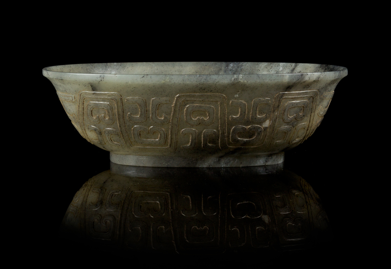 of a translucent stone with black specks and streaks, the oval shaped body raised on a short foot surmounted by an everted mouth, the body decorated with relief carved archaistic motif.