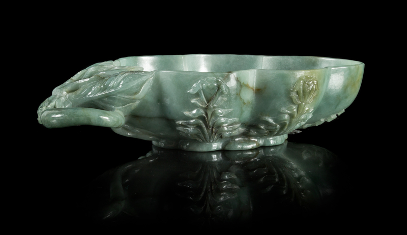 of floriate form, the handle in the form of a leafy vine, the exterior of each section carved to depict a flower atop a symmetrical leafy stem, the underside depicting a flower.