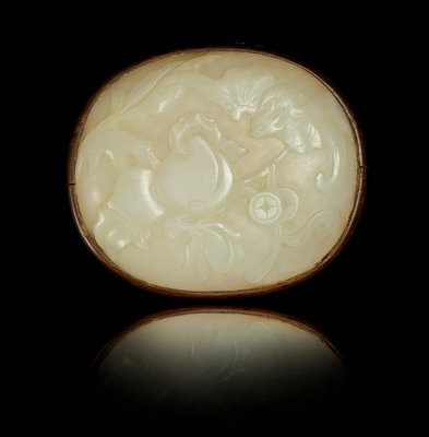 the even colored stone with white inclusions, of oval form, carved to the front in relief depicting a flying bat above peach branches suspending coins, set in a hardwood frame.