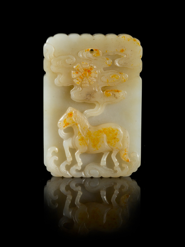 of an even colored stone with russet skins, of rectangular form with lobed upper and lower rims, carved to the front in relief showing a pacing horse between waves and a sun amidst clusters of clouds, the reverse with a poem underneath a pair of confronting chilongs.