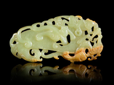 of a yellowish green stone some areas of russet skins, carved to show a boy figure fighting with a chilong above a large leave.