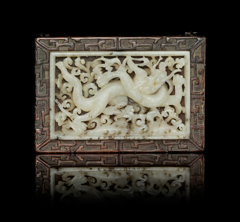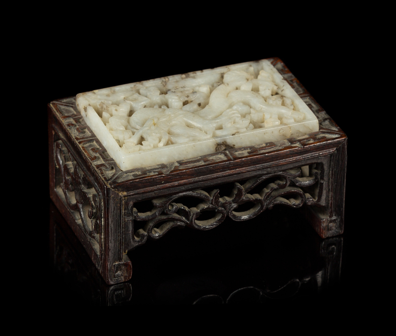 the rectangular jade plaque pierced carved with a sinuous dragon amongst foliate scrolls, the stone having white inclusions and grey specks, set in a small hardwood stand with openworked lotus scrolls and scrolled feet.