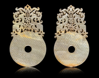 each of bi disc form carved with raised bosses surmounted by a pair of confronting stylized dragons flanking pierce carved characters.