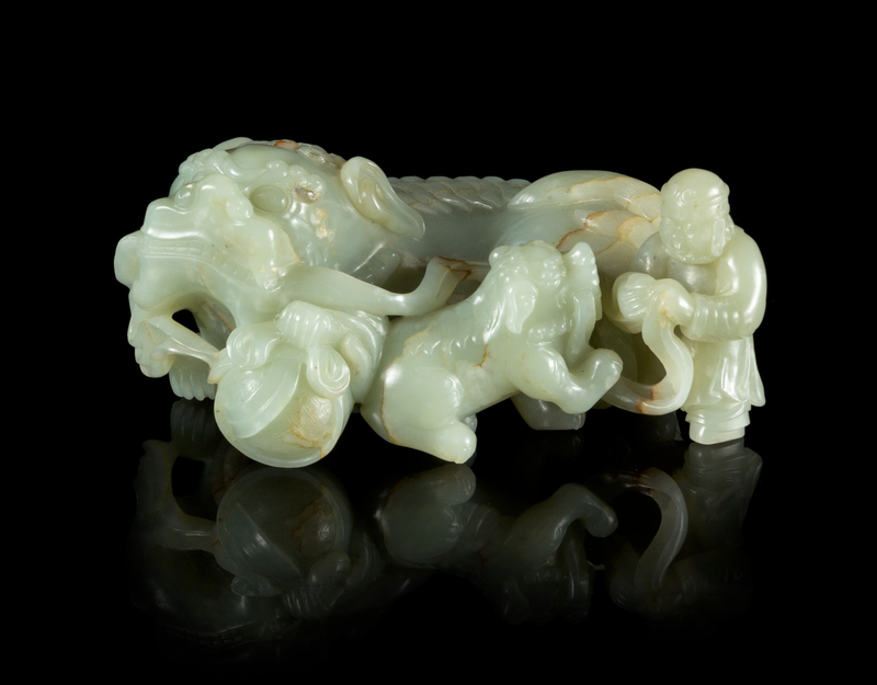 of an even colored stone with russet veining, depicting two fu lions, the larger figure recumbent with its front left paw placed on a beribboned brocade ball, the smaller figure resting next to it facing a standing male figure.