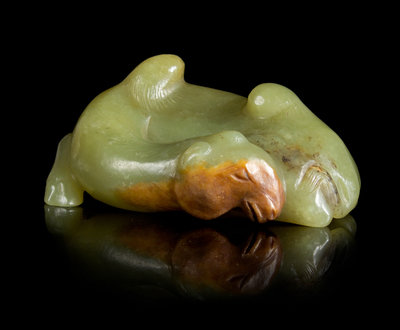 the stone of an yellowish green tone with russet patches, the camel depicted in a recumbent posture with its head lowered and turned backwards, the body carved with two raised humps.