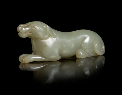 the animal figure depicted recumbent, the head forward facing with the mouth slightly open, the tail flicked to the side.