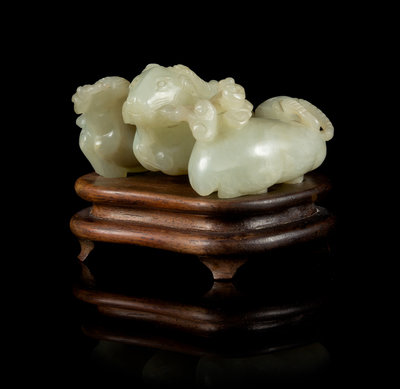 each ram depicted with all four legs folded under their bodies, bearing a lingzhi spray in their mouths, raised on fitted hardwood stand.