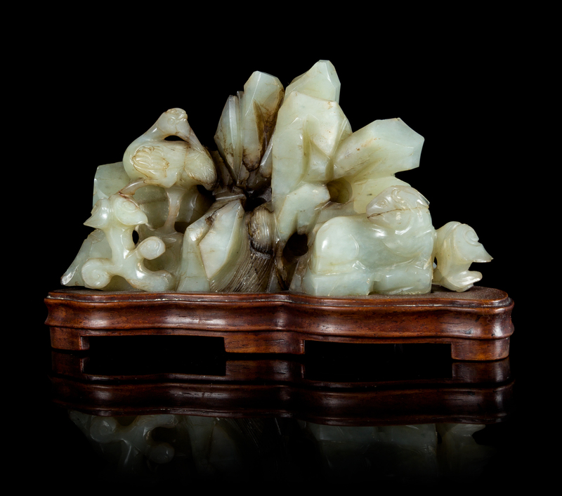 of naturalistic form, carved to depict a crane and a goat amongst the rocks together with a waterfall and flowering branches, raised on a fitted hardwood stand.
