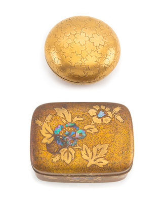 the first of rectangular form decorated with mother-of-pearl inlays depicting flowers, the second of circular form with allover cherry blossom decoration.