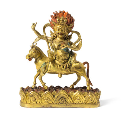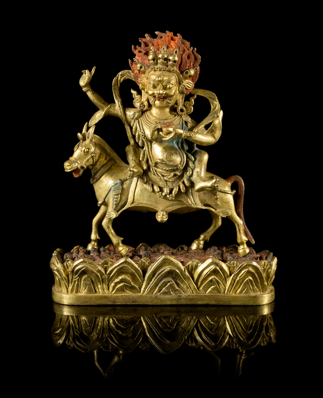 the figure depicted seated sideways on horse back, the face in a fierce expression, wearing elaborate jewelry and a flaming skull tiara, raised on a lotus plinth.
