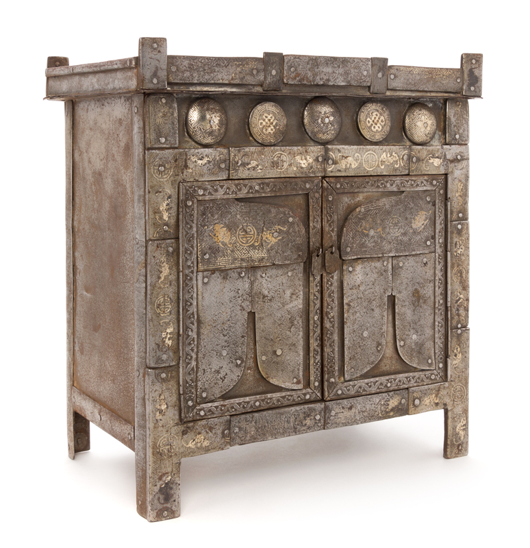 the rectangular top raised on a straight waist decorated with Buddhist emblems, above two doors, the sides decorated with depictions of bats.