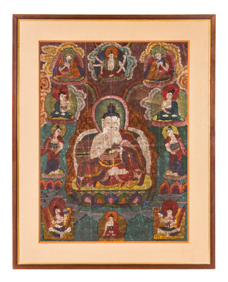 the central Buddha figure seated in dhyanasana on a lotus plinth wearing a dhoti and shawl draped over the shoulders, surrounded by ten other deity figures, framed.