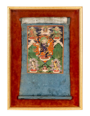 the central Mahakala figure standing, his left foot crushing a nude figure, wearing a crown of skulls, two guardians flanking a llama figure to the upper register, two wrathful deities to the lower register.