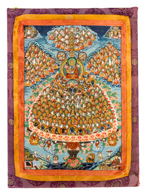 depicting Tsongkapa seated in the center flanked by lotus blossoms, surrounded by banks of bodhisattvas and immortals amongst clouds.