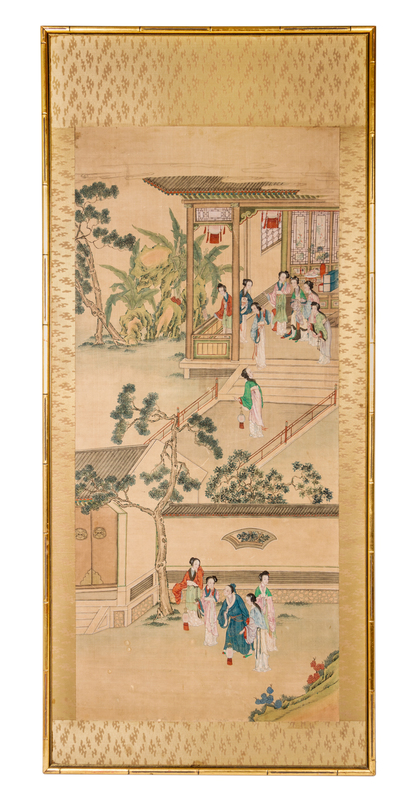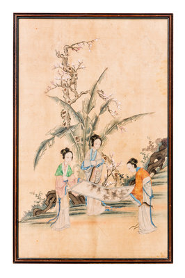 the first depicting three women viewing a scroll painting in a garden, the second depicting court beauties in a pavilion in a garden, both framed.