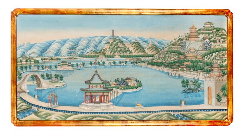 depicting pagodas and pavilions along the banks of a lake with mountains in the distance, framed.
