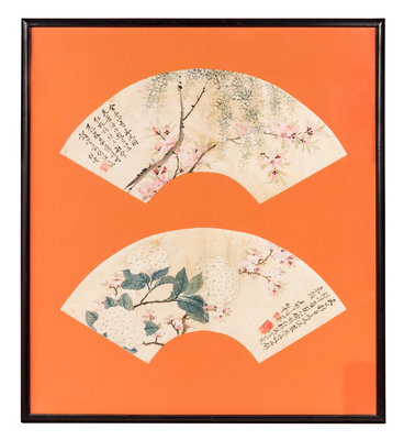 the first depicting prunus underneath willow branches, the second showing hydrangea amongst prunus.