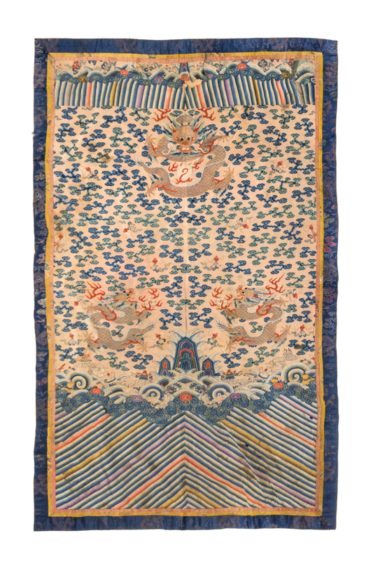 worked in multi-color threads depicting a sinuous dragon and a pair of confronting dragons amongst auspicious clouds, above mountain peaks emerging from crashing waves and beribboned Buddhist emblems, with lishui stripes to the upper and lower registers.