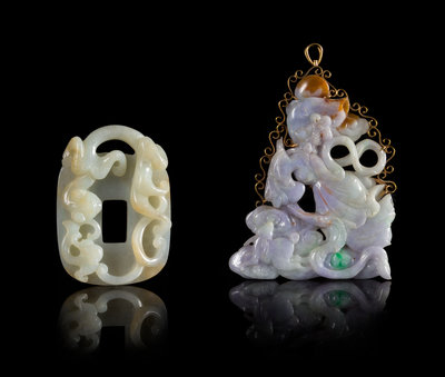the first a reticulated pendant carved to depict a Meiren and a rabbit amongst clouds, the second a belt hook carved with a chilong and winding vine.