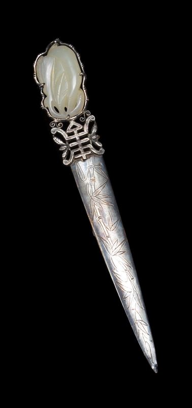 the metal blade incised to depict a bamboo stalk on each face, the handle with reticulated decoration enclosing a light celadon jade toggle carved to depict fruit with leaves.