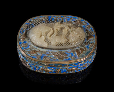 of oval form, the central jade reticulated plaque of oval form carved to depict a fish, vase, and flowering branch, the silver box decorated with blue enamel, depicting lotus plants, fish, seashells, vases, wheels and clouds.